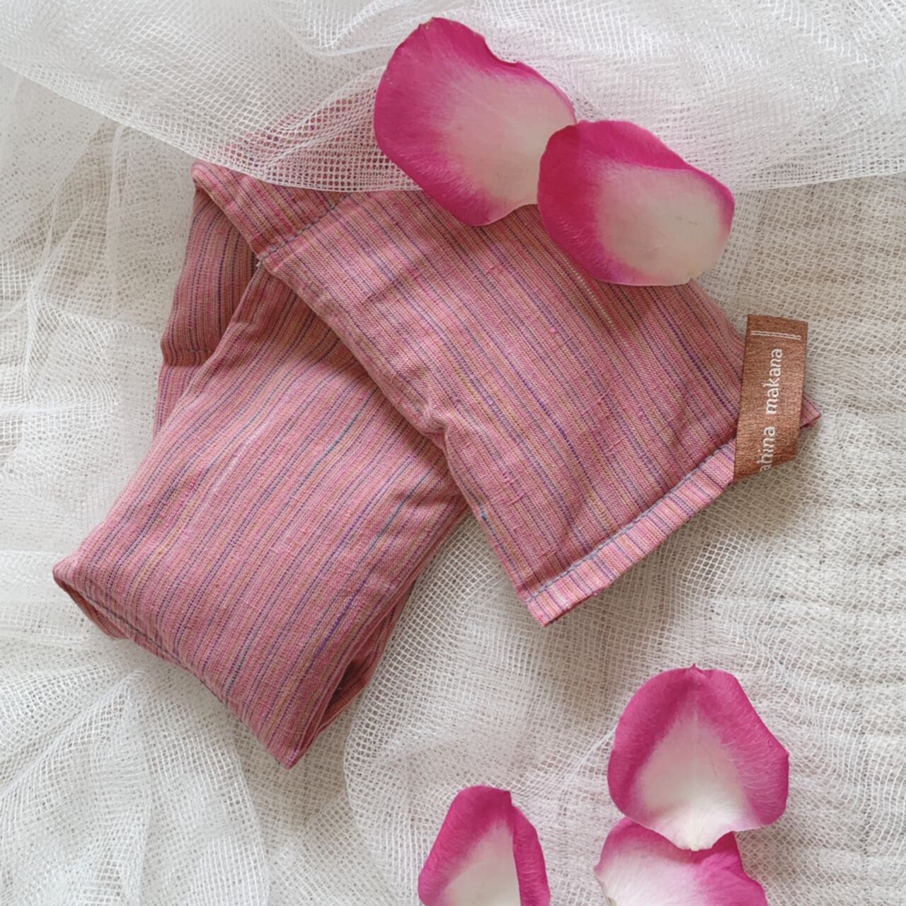 肩まわりや後頭部をじんわりと優しく温めてくれる小豆まくら。mahina makanaでは安眠やリラックス効果の高いラベンダーとローズの香りを豊かにつめこんでお届けします。